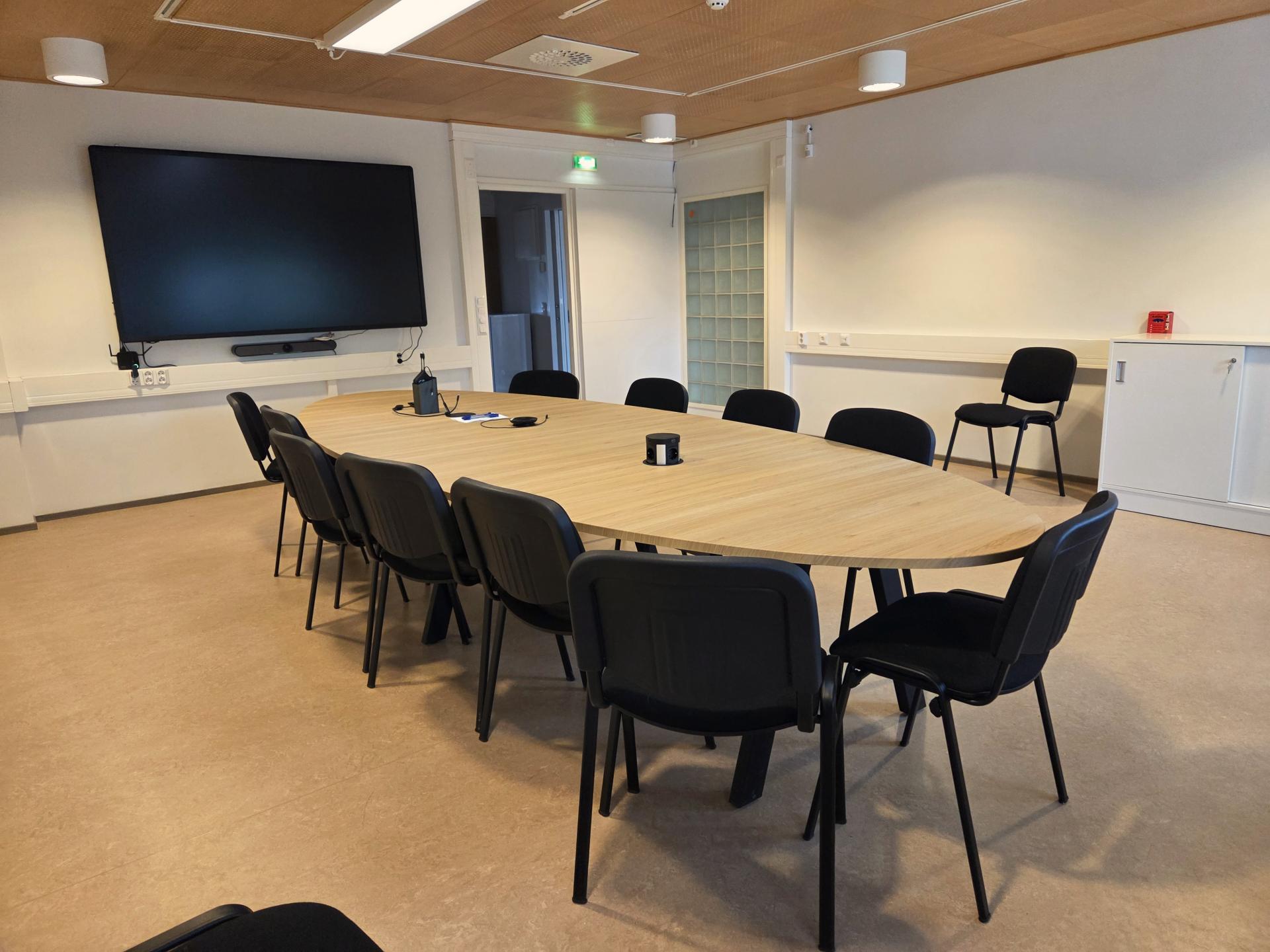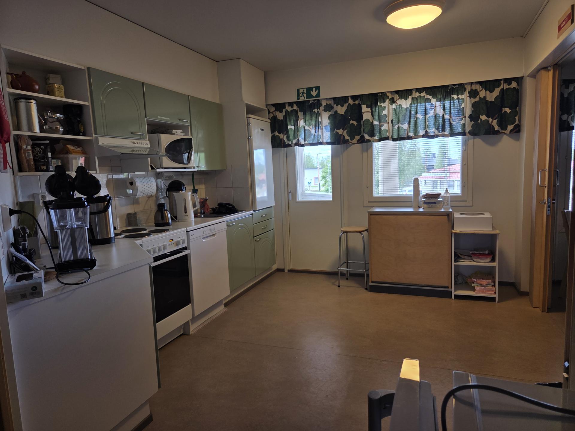 Kokoustilassa moderni, helppokäyttöinen laitteisto esityksiä / etäkokouksia varten. Käytettävissä keittiö kahvinkeittimineen, jääkaappeineen ja astiastoineen.